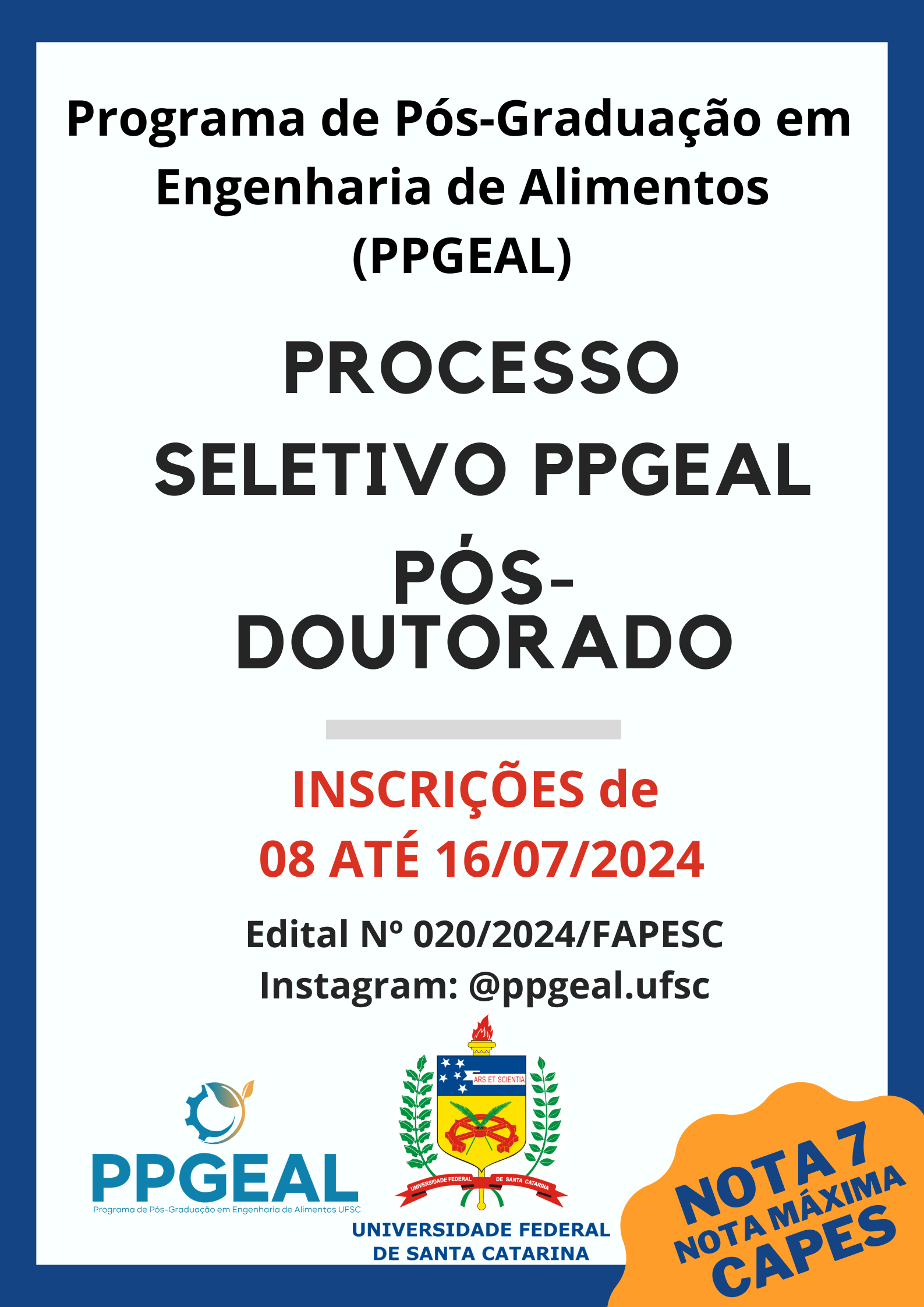 A Coordenadora do Programa de Pós-Graduação em Engenharia de Alimentos (PPGEAL), no uso de suas atribuições legais, torna público o Edital de Processo Seletivo para bolsa de pós-doutorado concedida pela FAPESC de acordo com o Edital Nº 020/2024/FAPESC.